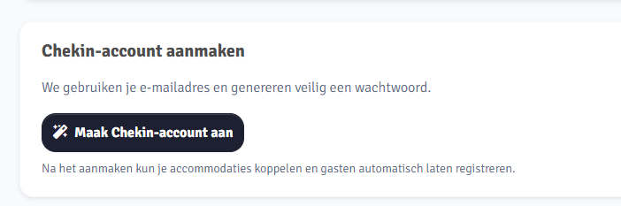 Ga in je Voyando Dashboard naar de Chekin integratiepagina. Klik op de knop om je Chekin account aan te maken. Doorloop alle stappen en vul alle gevraagde gegevens in.